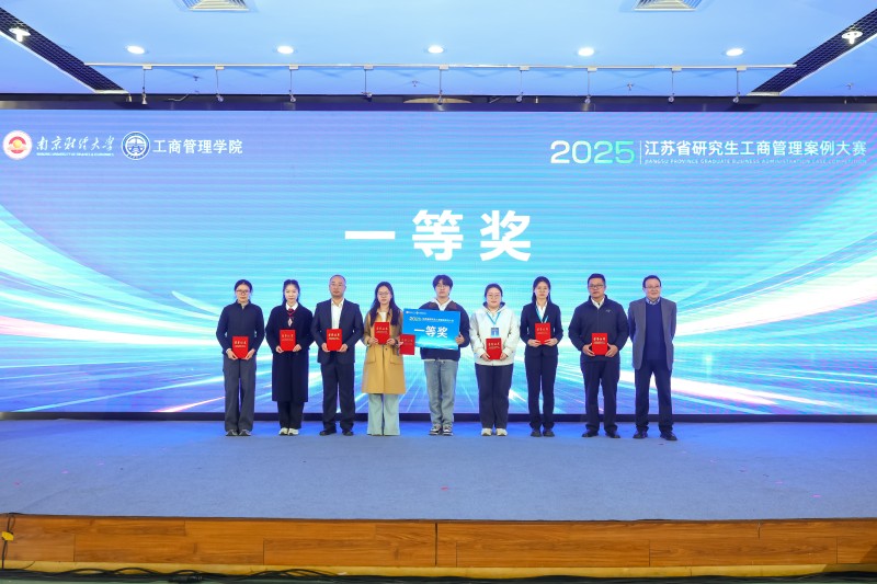 11月29日,2025年江苏省研究生工商管理案例大赛决赛在南京财经大学仙林校区举行。我校戴秋霞、张玲玲、杨玉颖、惠琰琦、刘月桃等九位研究生组成的“群贤毕至队”以总分排名第四的优异成绩,摘得大赛一等奖荣誉。同时,我校获得“最佳组织奖”,指导教师张长江获得“优秀指导教师奖”,案例合作企业中盐金坛盐化有限责任公司获“优秀案例主体奖”。